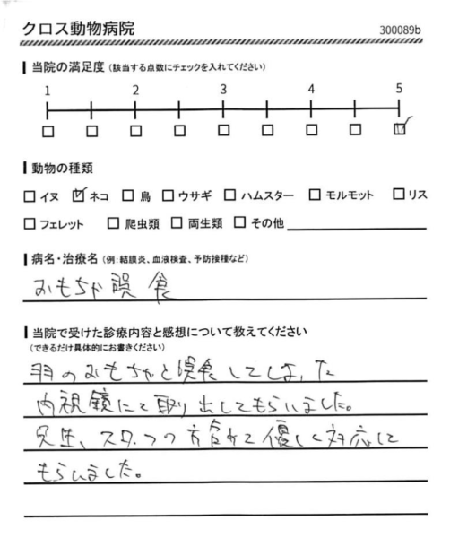 羽のおもちゃを誤食してしまった。 内視鏡にて取り出してもらいました。 先生、スタッフの方含めて優しく対応してもらいました。